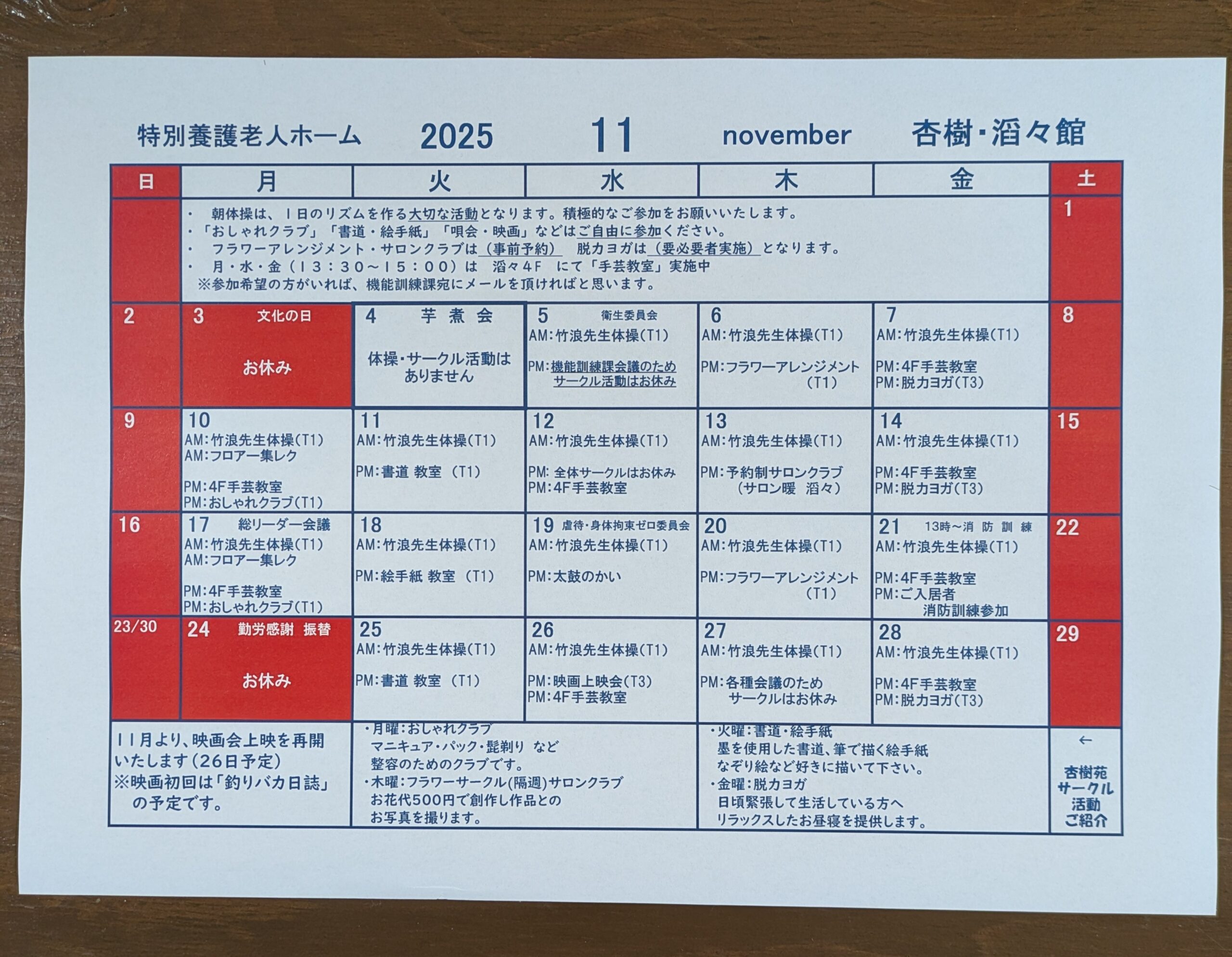 来月11月の特別養護老人ホーム杏樹苑/杏樹苑滔々館のイベントカレンダーです♪